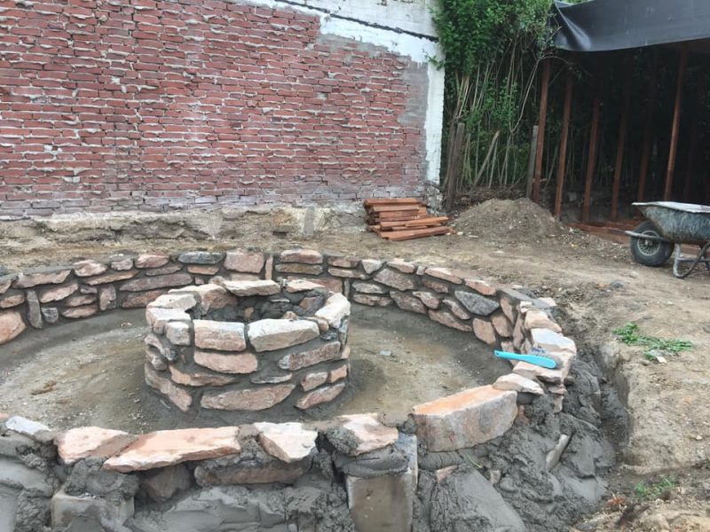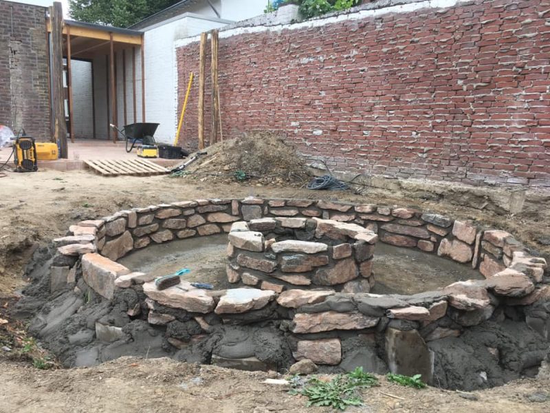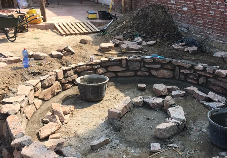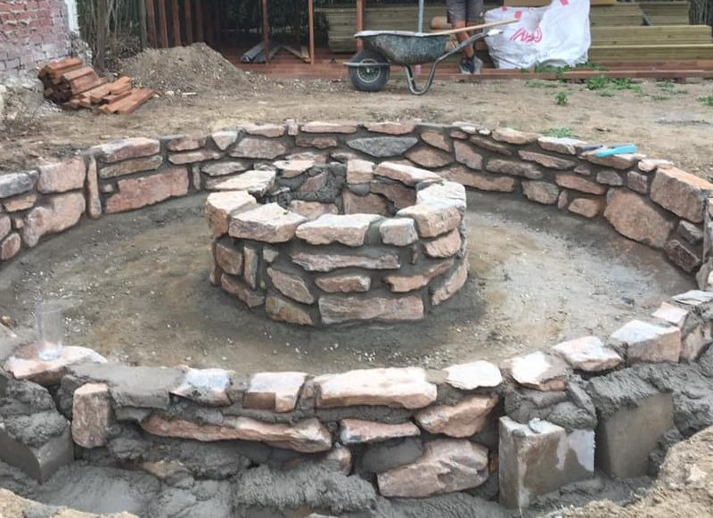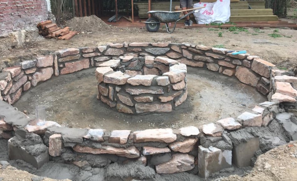 Hier hebben we een zitkuil gemaakt met in het midden een stookplaats voor de wat koudere avonden. De zitkuil is gemaakt van een soort maaskei.